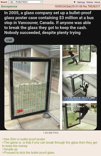 What is the point then. I’d be pissed if someone was able to break a regular window by kicking it. If you have to prove that your bullet proof glass can stand up to kicks I’m not going to be confident in your product. Let people bring their own shit and show what it would take to get through it. You know, unless it sucks, which I assume to be the actual case here.