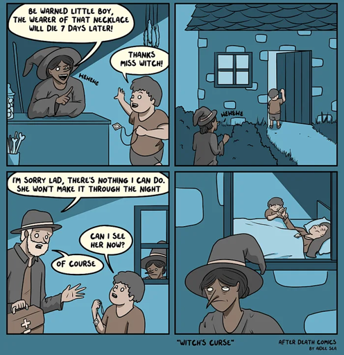 Body: the witch sold something an is thus in customer service. Even though her profession appears to be cursing people, she found a way to feel horrible through work anyway