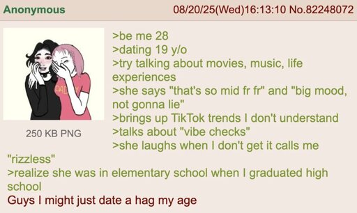 arrow-up1401arrow-down1imageAnon dates a 19 y/osh.itjust.works🍹Early to RISA 🧉@sh.itjust.worksM to Greentext@sh.itjust.works · 2 个月前message-square195linkfedilink