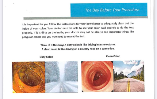 My elderly neighbor doesn’t exactly follow rules. She had a colonoscopy earlier this year. They sent her home because she “wasn’t clean.” She had to repeat the process later, and I can’t imagine she was a Sunny Country Road, but they at least completed the exam that time. I am still mortified for her, my first colonoscopy was last year, I spent a full day on the toilet prepping. Nearly slept in the bathtub.