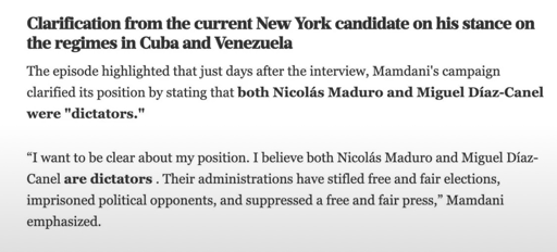 " I want to be clear on where I stand. I believe both Nicolas Maduro and Miguel Diaz-Canel are dictators. Their administrations have stifled free and fair elections, jailed political opponents, and suppressed the free and fair press. And yet, our federal government’s long history of punitive policies toward both countries, including extrajudicial killings of Venezuelans and the continuation of a decades long blockade of Cuba, have only worsened these conditions. Democratic socialism is about dignity, justice and accountability. And above all, it’s about building a democracy that works for working people, not one that preys on them."