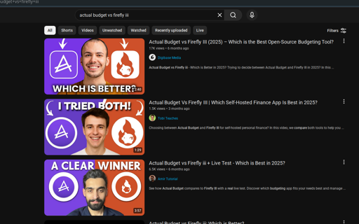 Multiple videos that have the same style of thumbnail (AI generated face excepted). Multiple videos with a very similar thumbnail and exact same wording. They’re all within the past year, mostly within the past 6 months (this software has existed for many years, why all of a sudden do multiple channels want to do vs or review videos of them). They’re all short videos and its just not possible to give a proper breakdown of feature or a review of budgeting software in that amount of time. The few videos I tested used AI voices and all had a similar start (I didn’t waste my time watching the whole video). The faces on the videos look AI generated or modified…