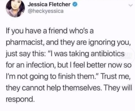 The meme you commented under is about someone getting attention by prematurely stopping to take antibiotics.